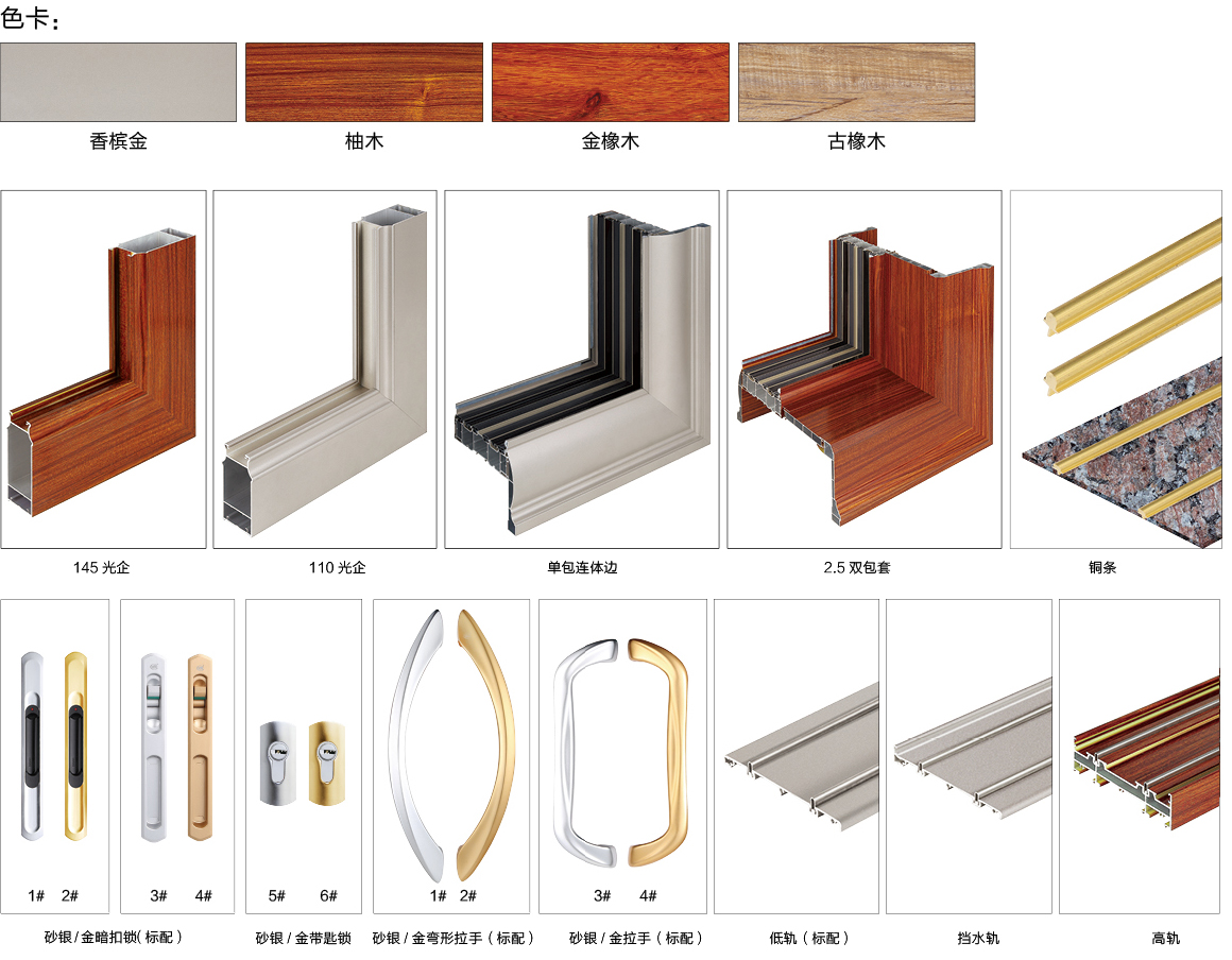 型材。移门实用的型材基材大体有两种:一种是铝合金,一种是塑钢。由于铝合金具有重量轻、强度高等特点,是移门基材的高档材料。已经渐渐取代塑钢产品。而铝合金本身又分为普通铝镁合金和更小特种航空用铝镁合金。由于铝镁钛硅合金具有更高的强度和更小的重量。所以深受消费者亲睐,但成本却几倍于普通铝镁合金。在看型材的时候,不但要注意基材,还要观察它的表面处理。高级的表面处理有阳极氧化,电泳覆膜炭喷涂等工艺,这些工艺要比简单的喷涂和电镀具有更高的硬度和美观性。