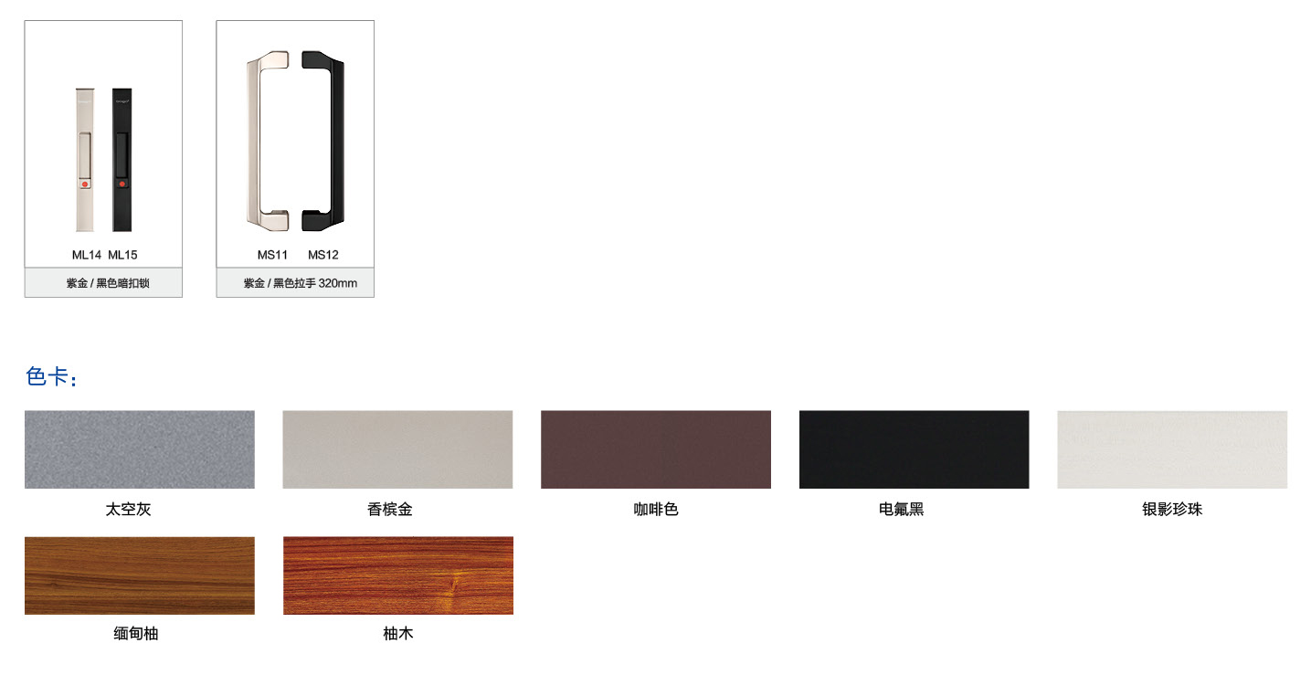 ※门扇上滑轮采用嵌入式定向轨道结构,推拉顺畅、静音。